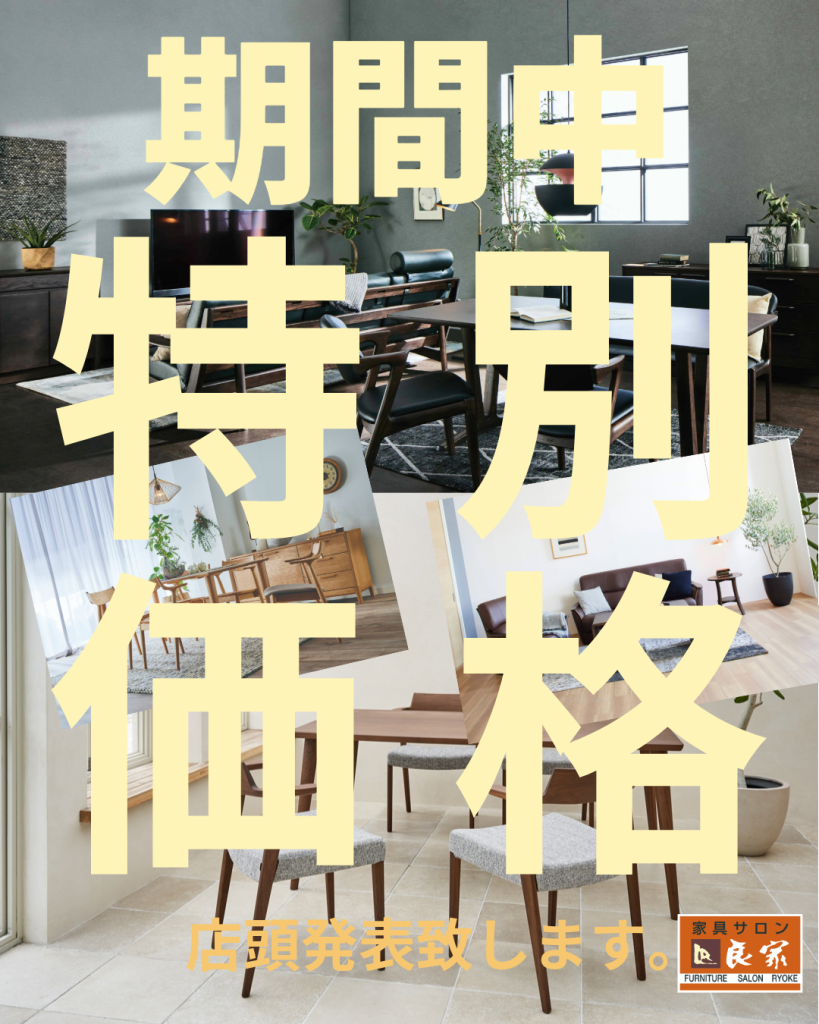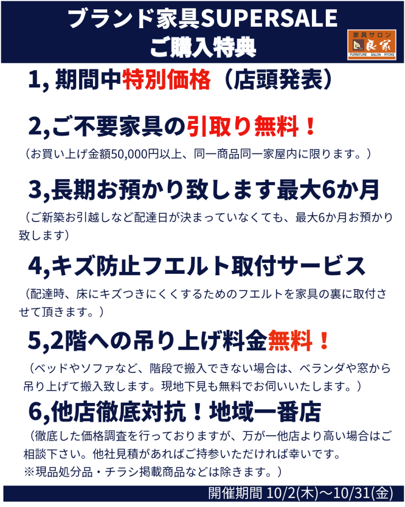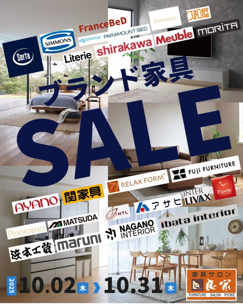 10/2(木)より10/31(金)まで、良家各店では、「ブランド家具スーパーSALE」を開催しております。「ちょっといい家具に買い替えたい。」「新築でいい家具が欲しい。」方必見!国産ブランド家具がお安く買える1ヵ月です。飛騨の家具(シラカワ・飛騨産業・イバタインテリア)やベッドメーカー(シモンズ・サータ・フランスベッドetc)福岡大川の家具(ナガノインテリア・関家具・モーブルetc)などなど、弊社取扱いメーカーの家具を特別価格にて大ご奉仕致します。さらに、このホームページを見たと係員にお伝えいただくと、ご不要になった家具を無料でお引取りさせて頂きます。(5万円以上お買い上げ、同一商品、同一家屋内に限ります。)ぜひこの機会に良家各店へお越しください。
